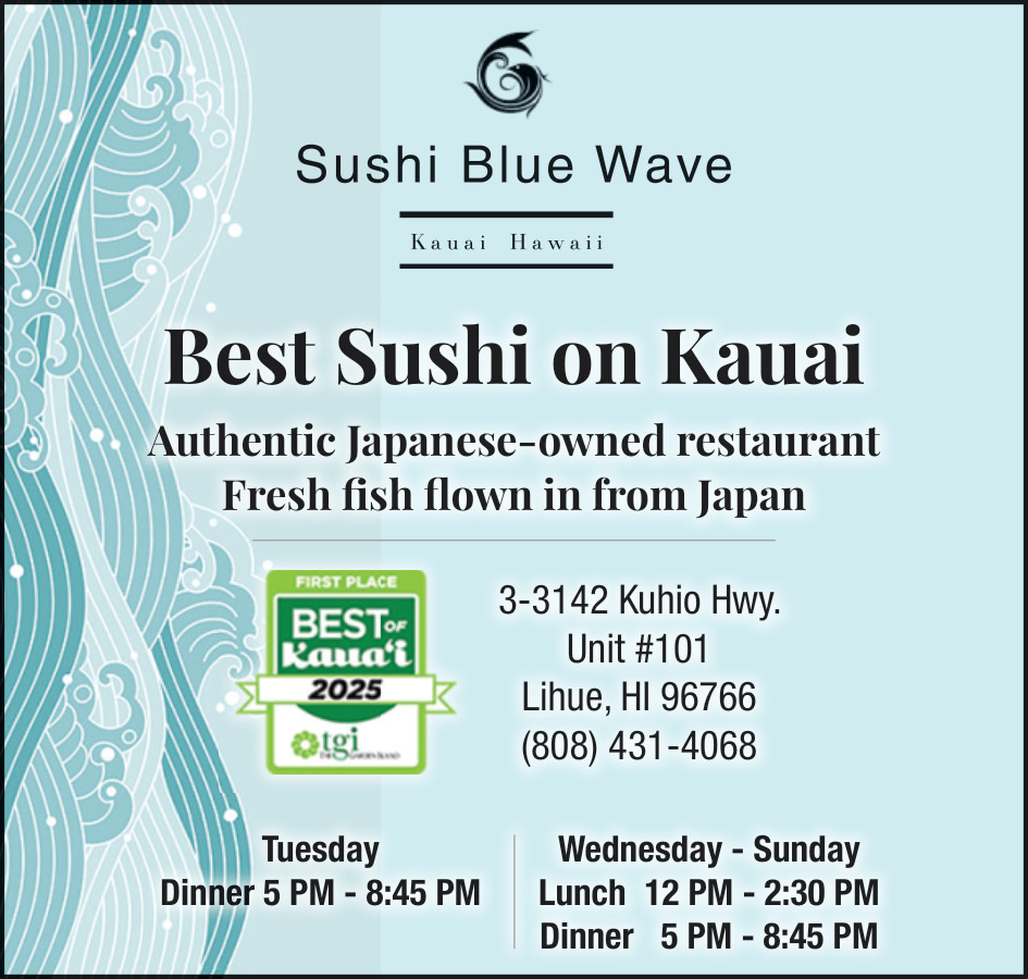 Feb 23, 2026. Sushi Blue Wave Restaurants Ads from The Garden Island